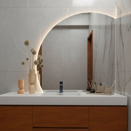 Bring modern art and functionality together with this half circle LED wall mirror, designed to add sculptural elegance to your bathroom, bedroom, or vanity area.Its curved frameless shape and soft...