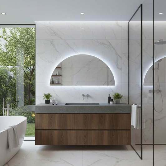 Bring contemporary elegance to your bathroom with this LED Backlit Half Arch Mirror, designed to elevate both functionality and style. The soft halo light creates a soothing glow that enhances...