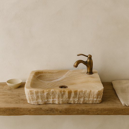 Elevate your bathroom with this luxury Onyx Marble vessel sink, hand-carved from a single block of natural stone. Its stunning layered onyx patterns, warm beige tones, and raw-edge exterior create...