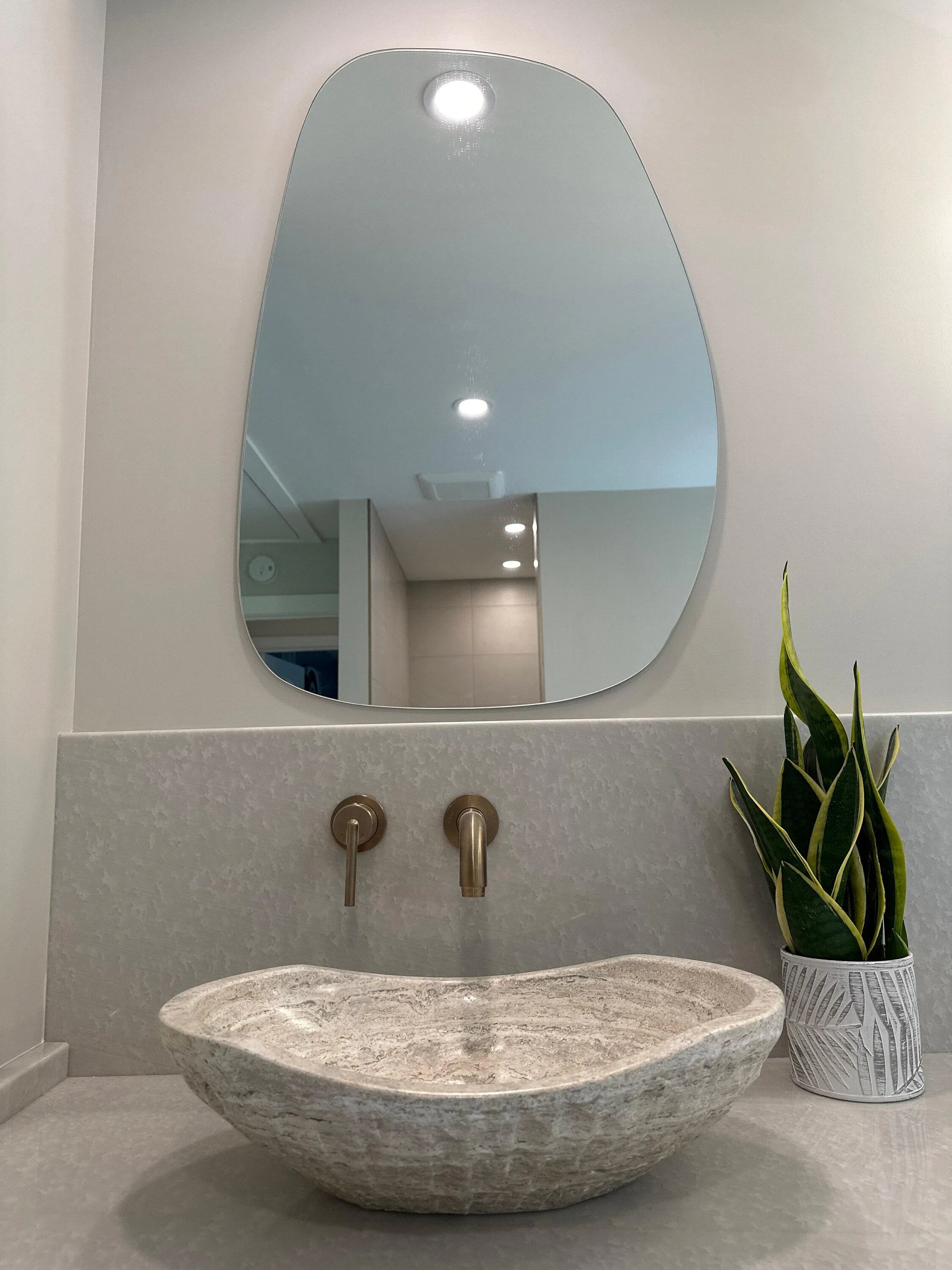 Its frameless polished edges and clean shape make it perfect for bathrooms, bedrooms, entryways, and living rooms, complementing modern, Japandi, or minimalist decor styles.