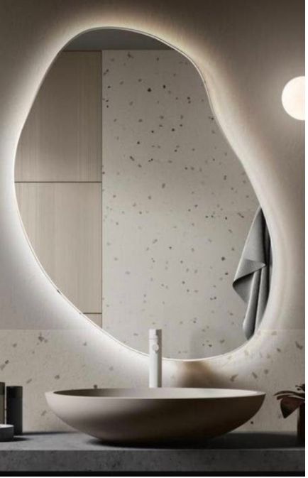 Its flowing asymmetrical form and soft backlight create an elegant sculptural statement — ideal for bathrooms, bedrooms, entryways, or spa-inspired interiors.