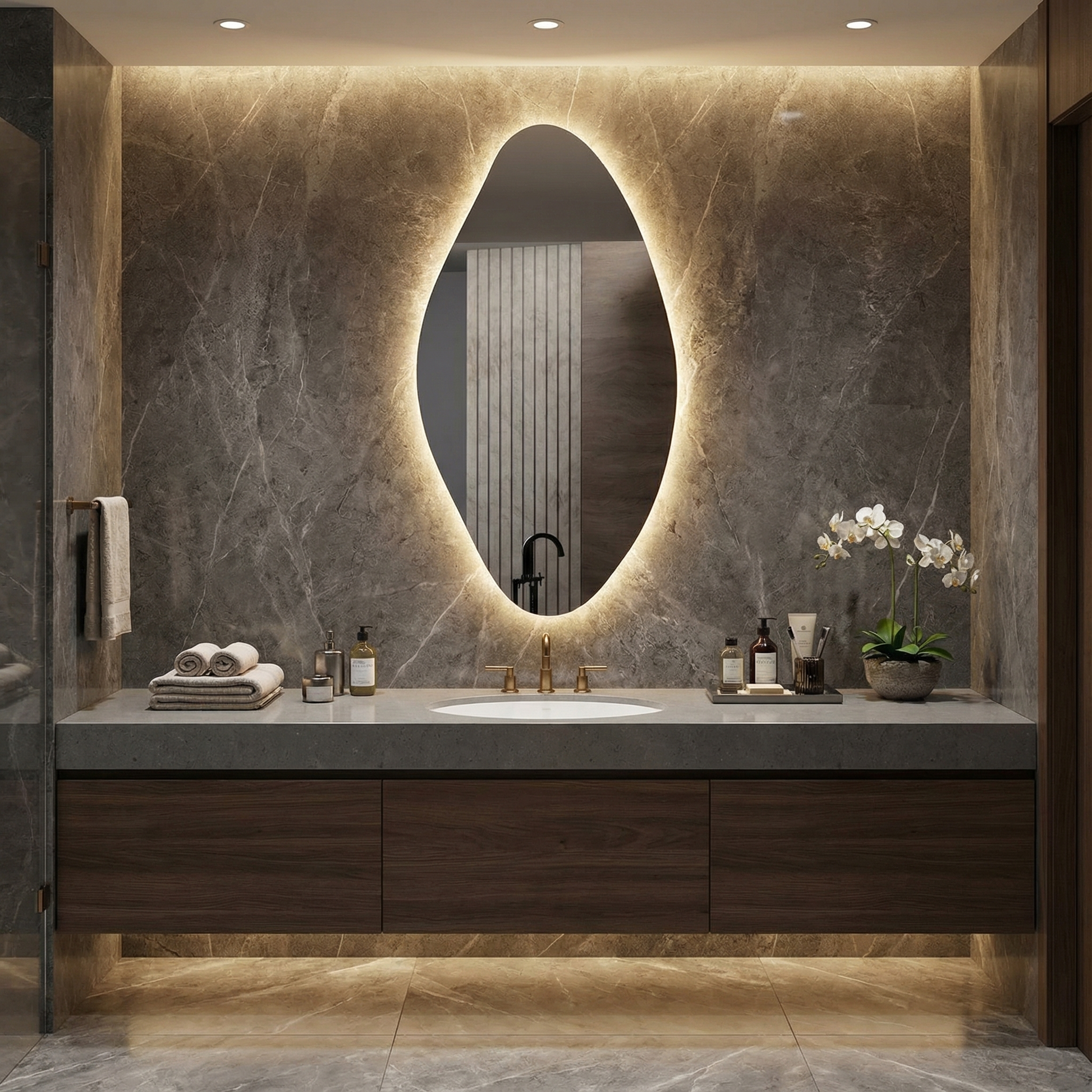 Its soft backlight and sculptural shape make it a perfect centerpiece for bathrooms, powder rooms, and dressing areas — creating a spa-like ambiance in any home.