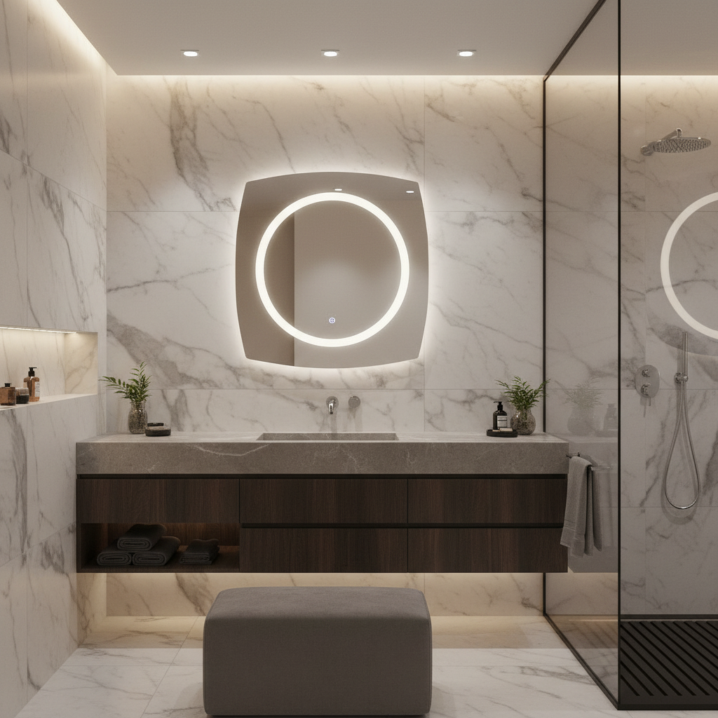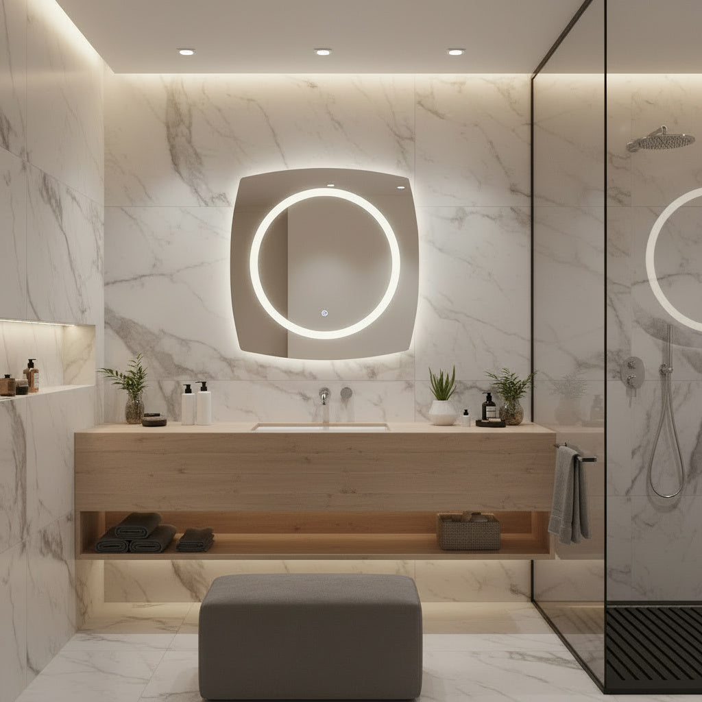 Upgrade your space with this modern square LED mirror, designed to bring both style and practicality to any bathroom, dressing area, or vanity corner. Its minimalist shape and ambient lighting make it a centerpiece of contemporary interior design.