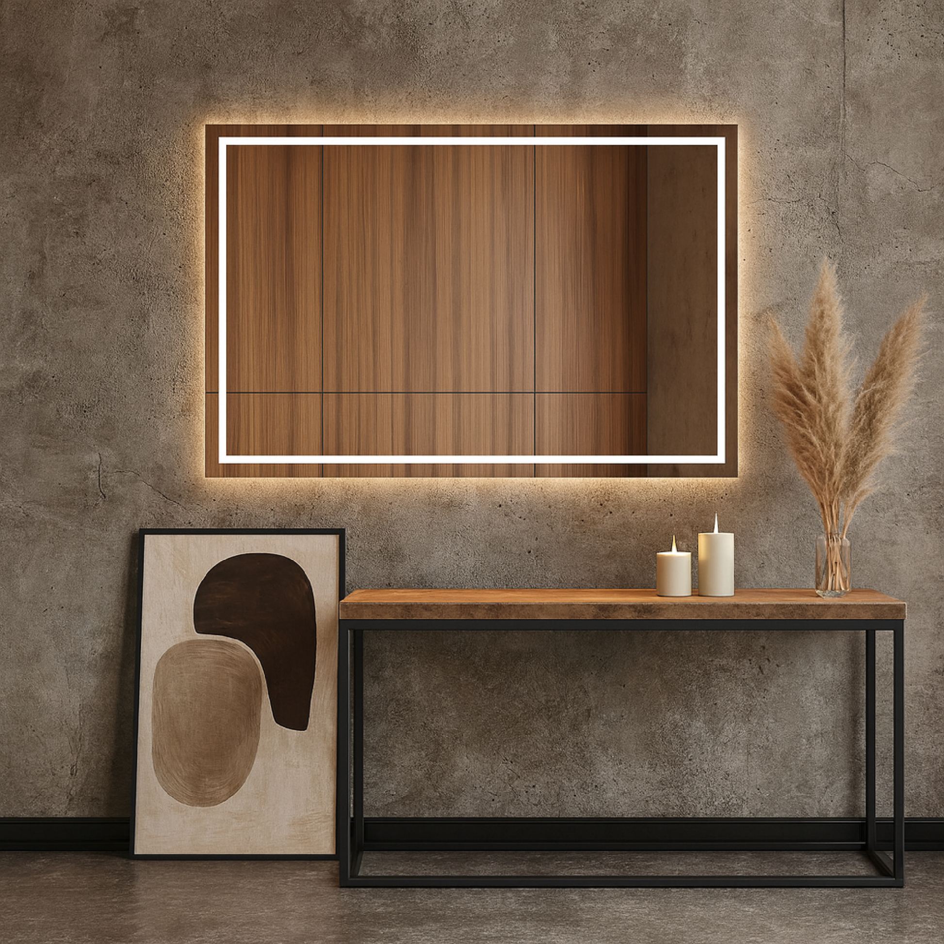 Upgrade your space with this Rectangular Backlit LED Mirror, combining sleek design with functional illumination.