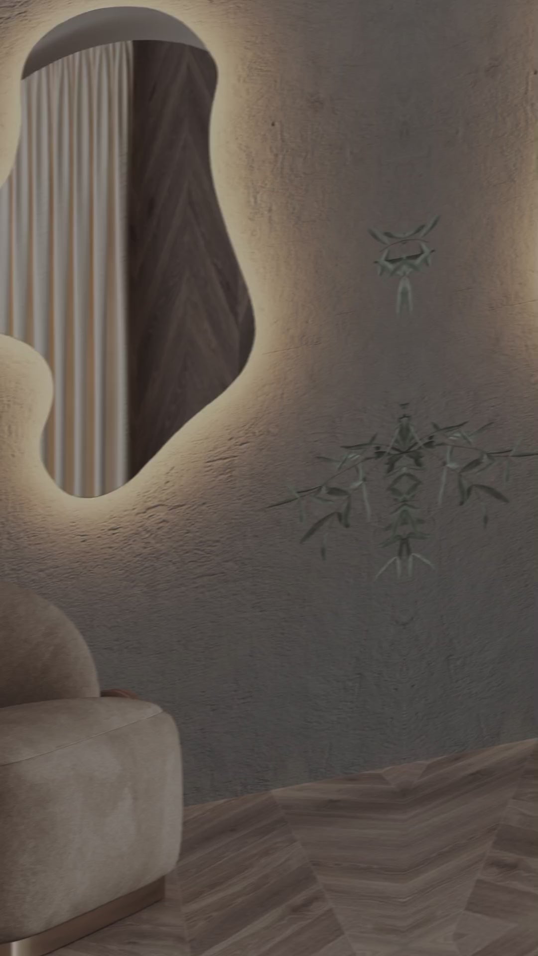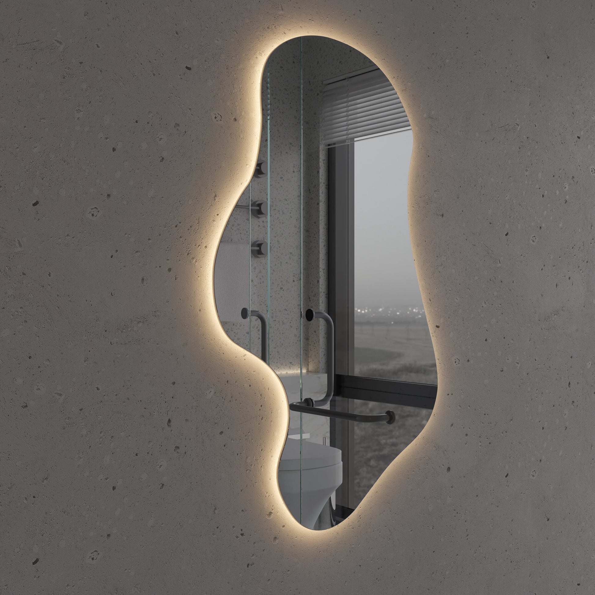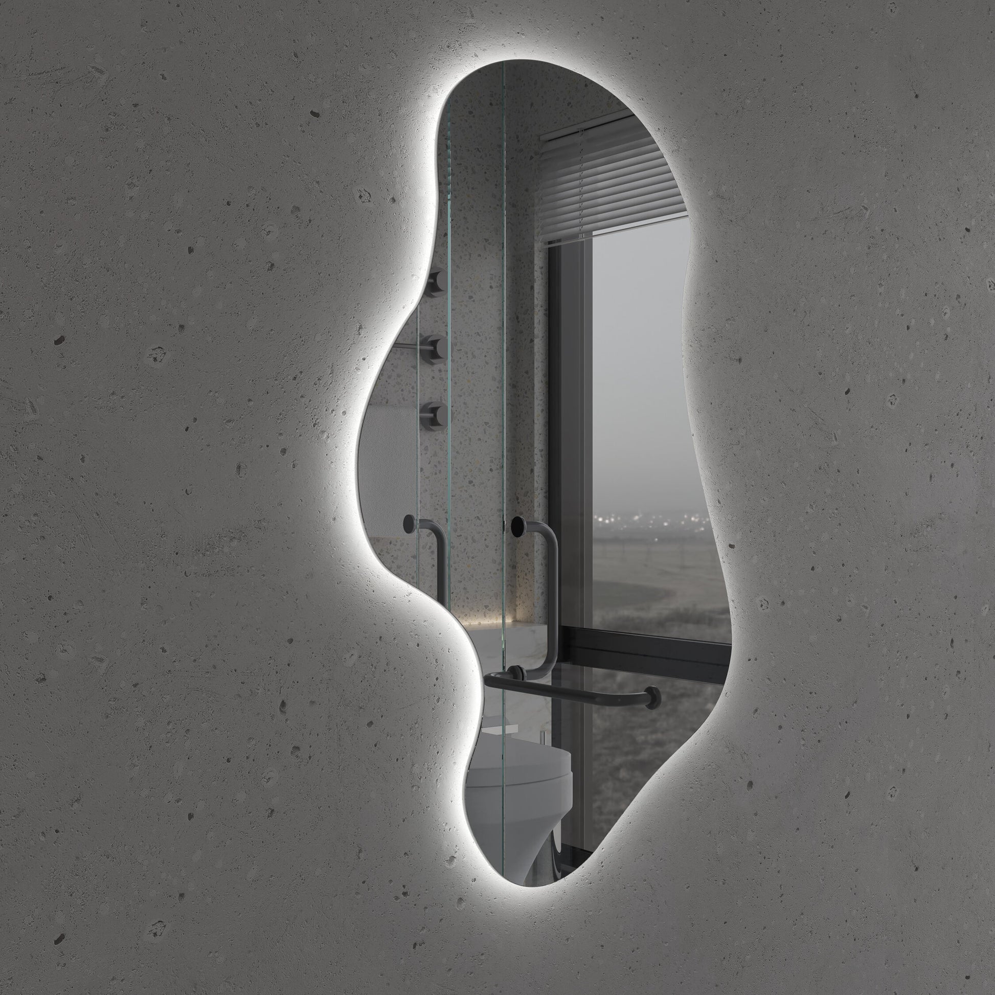 Bring artistry and modern luxury into your interior with this organic-shaped LED backlit mirror — a perfect statement piece for any bathroom, vanity, or hallway.
