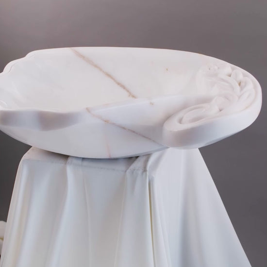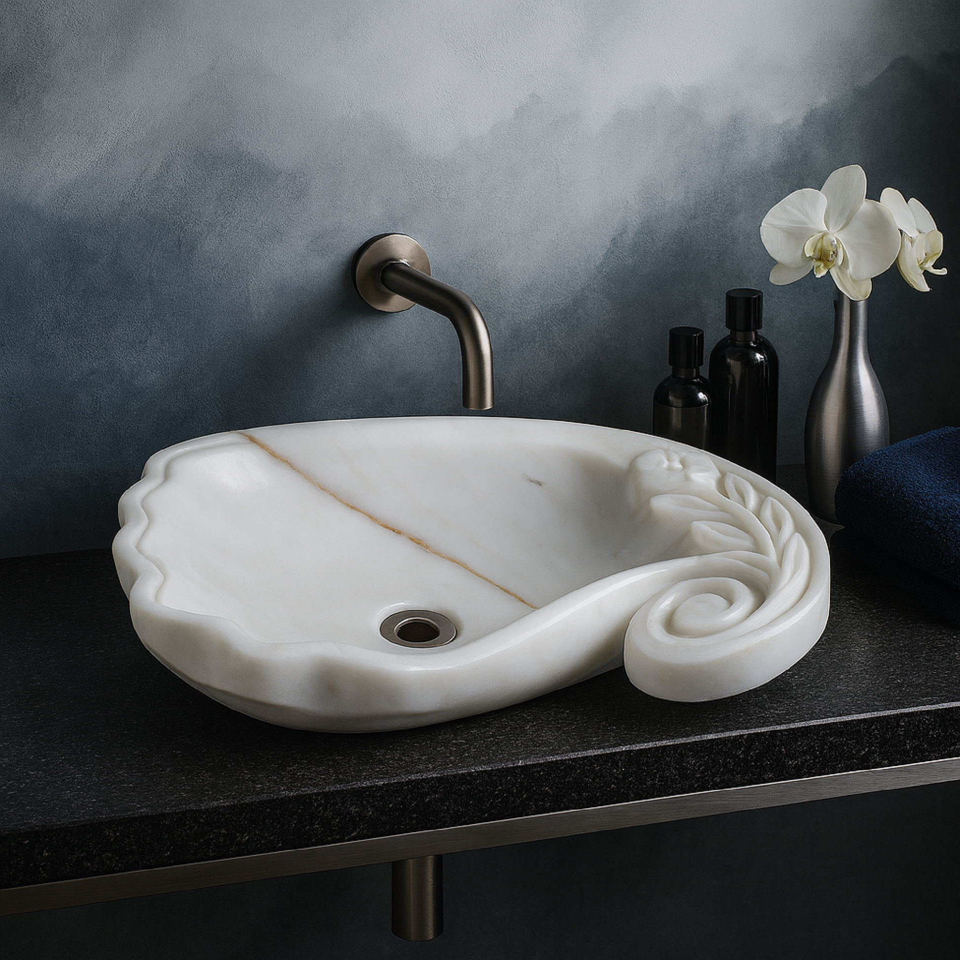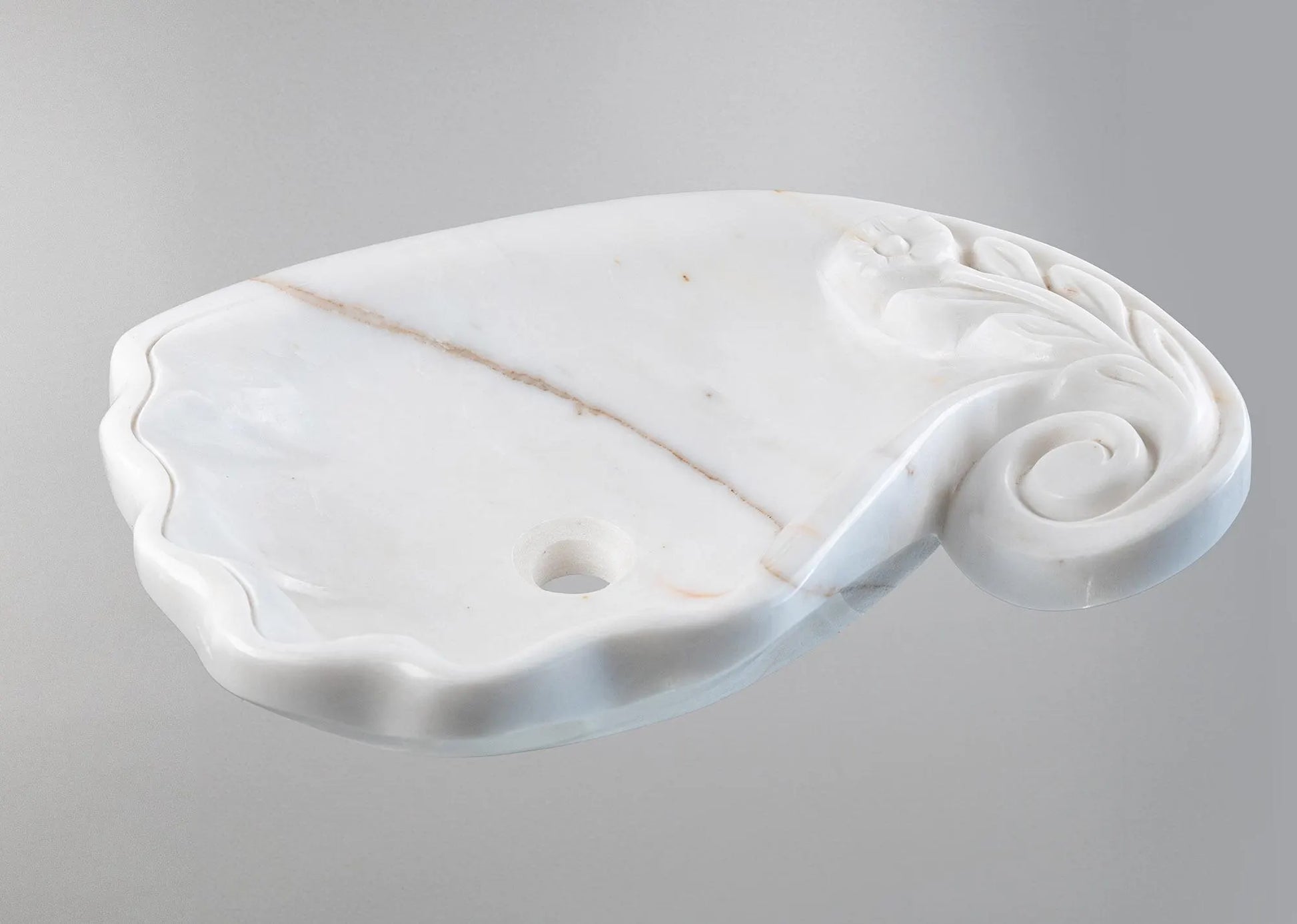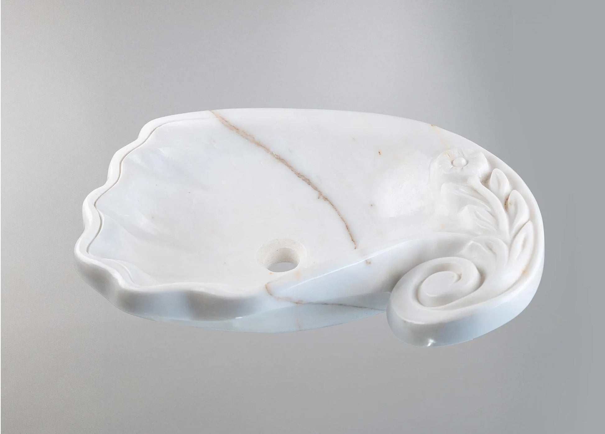 This handcrafted marble sink combines elegance and craftsmanship. Sculpted from a solid piece of natural marble, it features softly curved lines and a delicate carved floral motif that enhances the timeless beauty of stone.