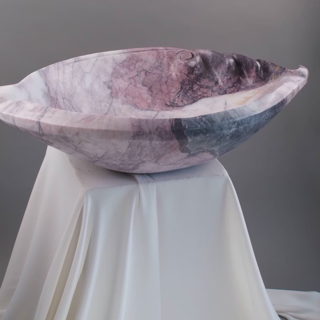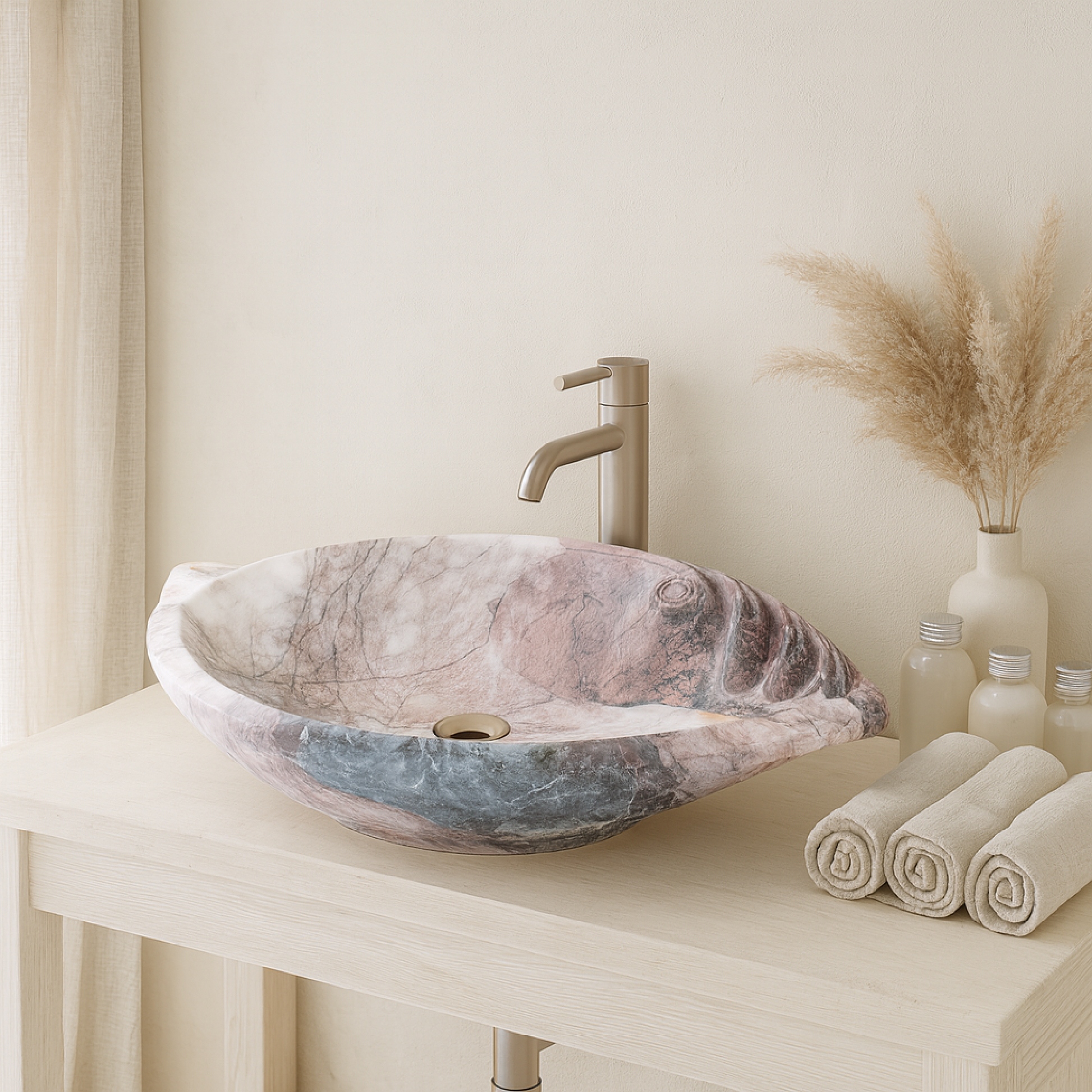 This luxury vessel sink is carved by hand from a single block of marble, showcasing a harmonious blend of rose, cream, and gray hues. The natural veining pattern makes each sink a one-of-a-kind statement piece for sophisticated interiors.