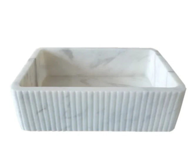 Elevate your bathroom design with this Carrara White Marble Wall-Mount Bathroom Sink, featuring a striking ribbed textured exterior and luxurious modern silhouette. Hand-carved from a single block of genuine Carrara marble, this designer sink brings timeless elegance and superior craftsmanship into any bathroom or powder room.