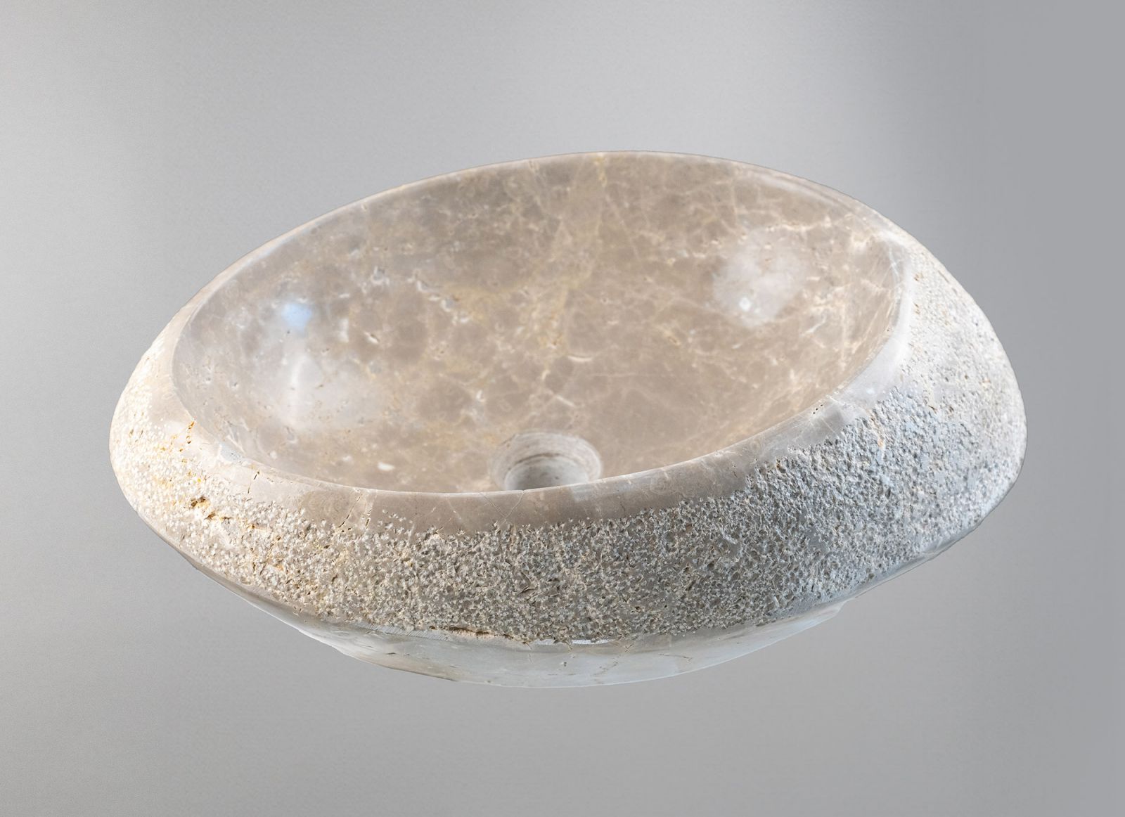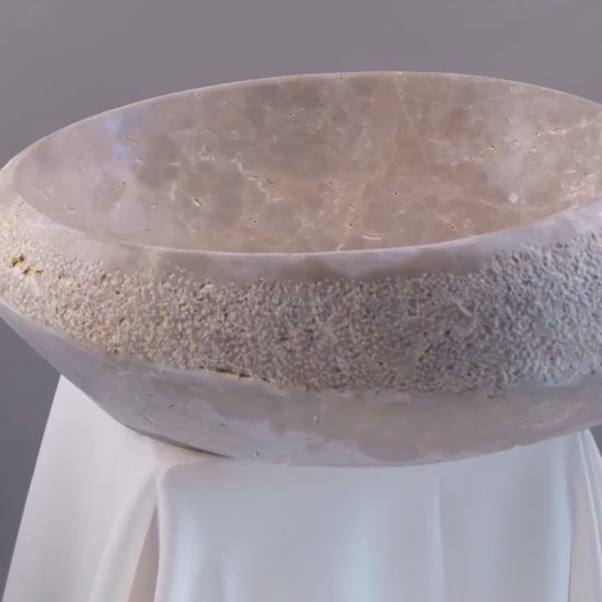 This vessel sink is sculpted from a solid piece of natural marble, combining a smooth polished inner surface with a raw, textured outer edge that highlights the stone’s organic beauty. No two pieces are ever the same — each one is a distinct natural masterpiece.
