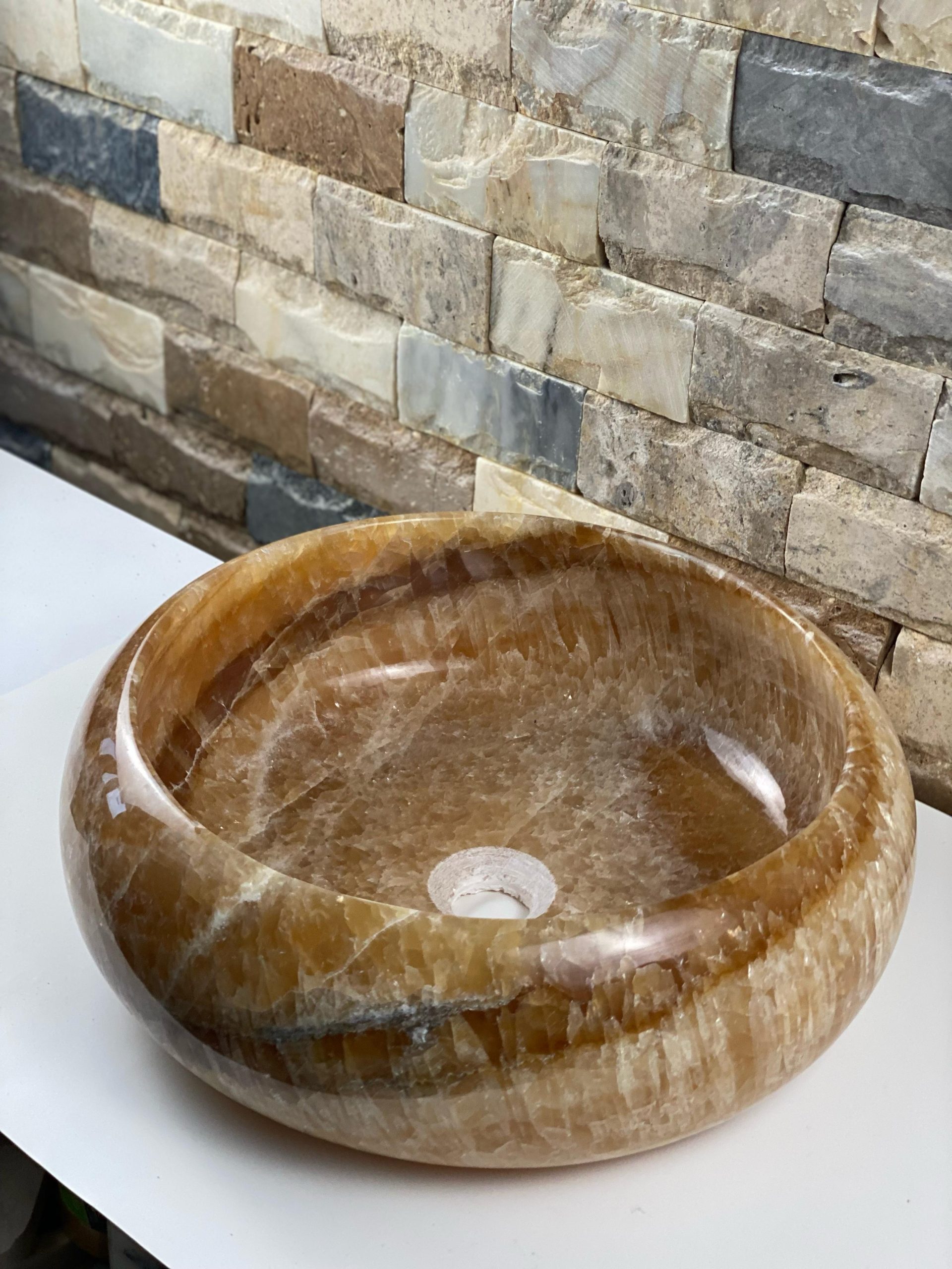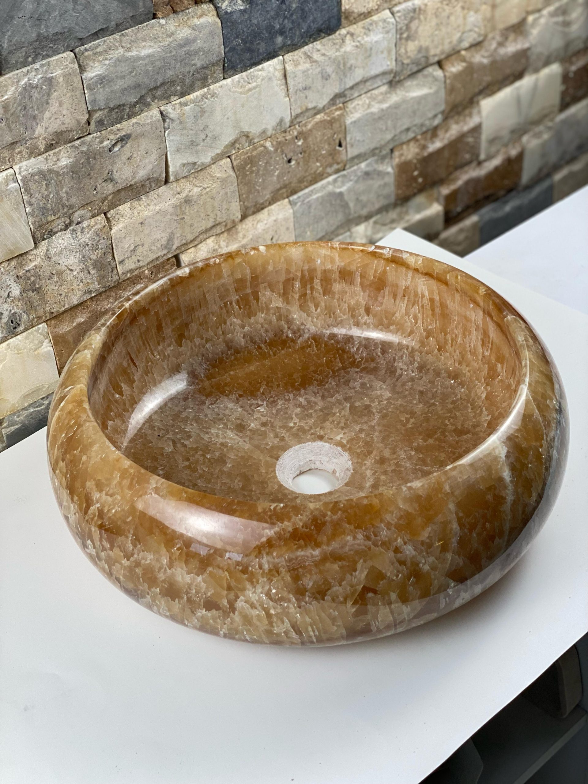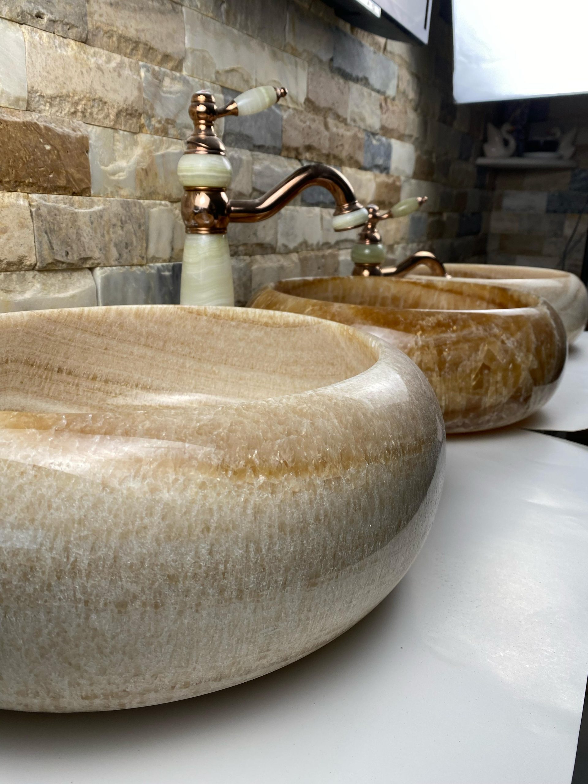 Elevate your bathroom with this stunning handmade Honey Onyx vessel sink, a perfect blend of luxury, nature, and craftsmanship. Carved from a single block of natural onyx, this sink features a mesmerizing golden honey hue with translucent veining, creating a unique and elegant statement piece.