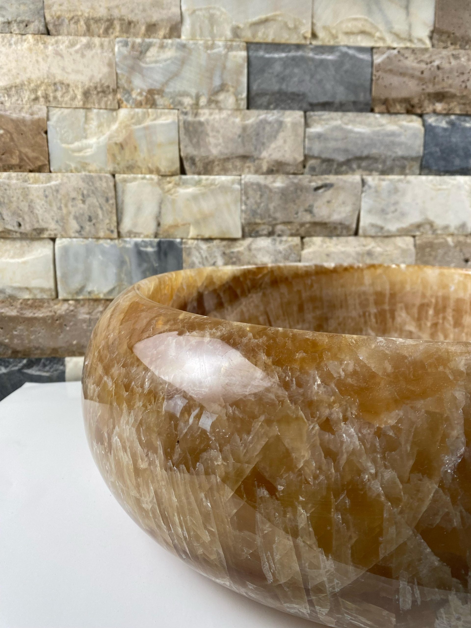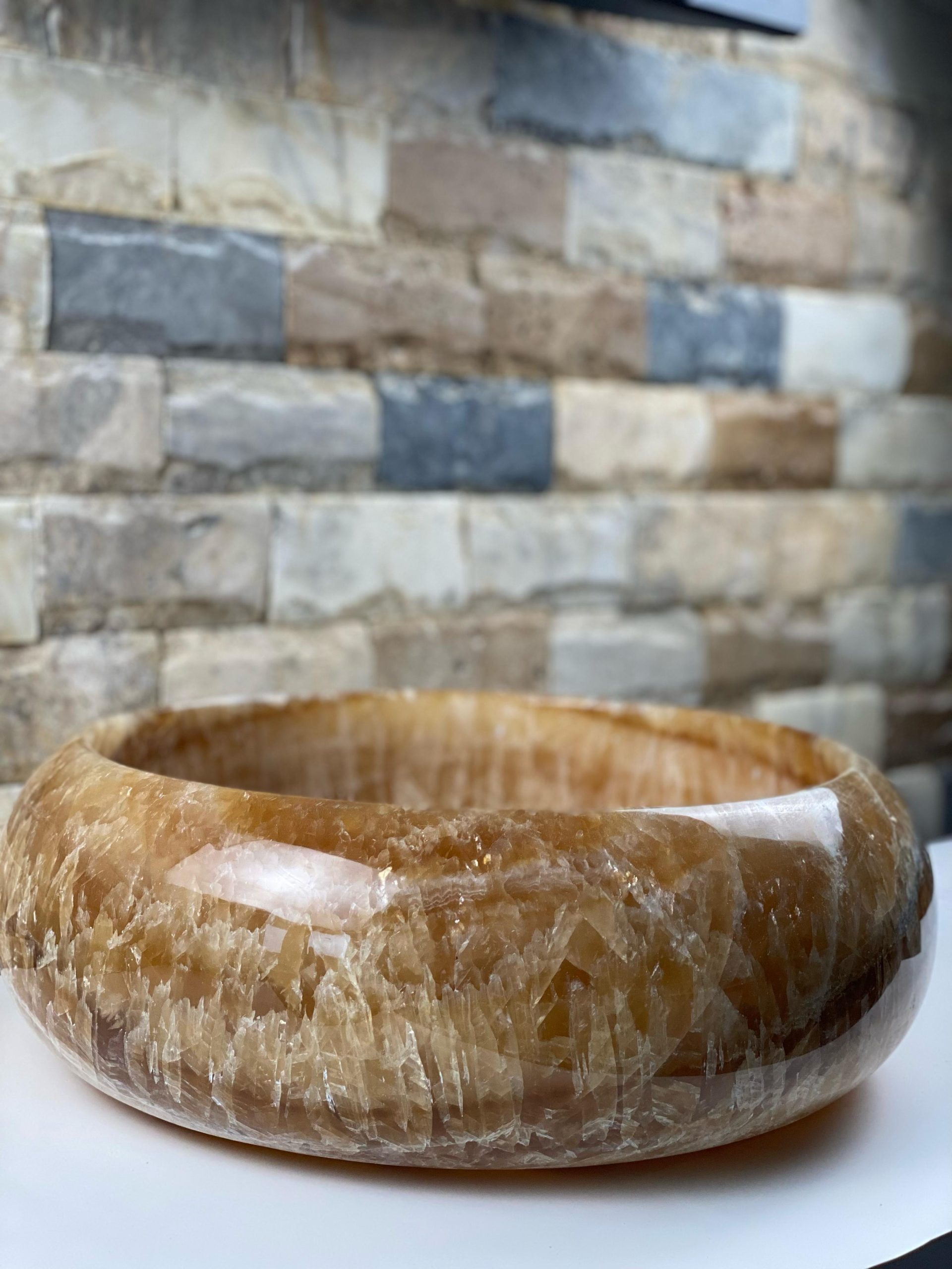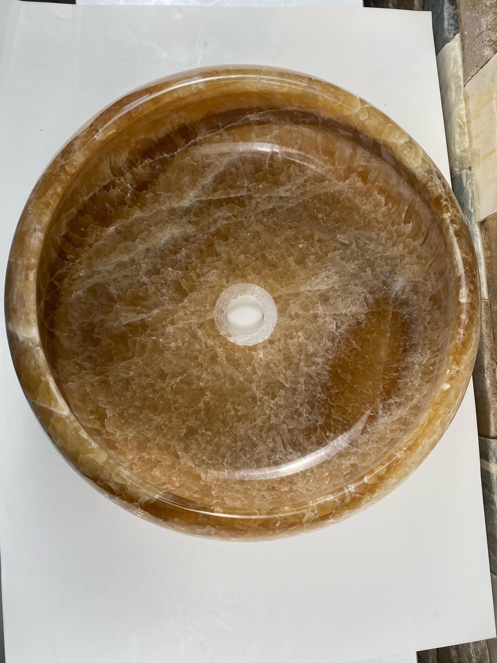 Elevate your bathroom with this stunning handmade Honey Onyx vessel sink, a perfect blend of luxury, nature, and craftsmanship. Carved from a single block of natural onyx, this sink features a mesmerizing golden honey hue with translucent veining, creating a unique and elegant statement piece.